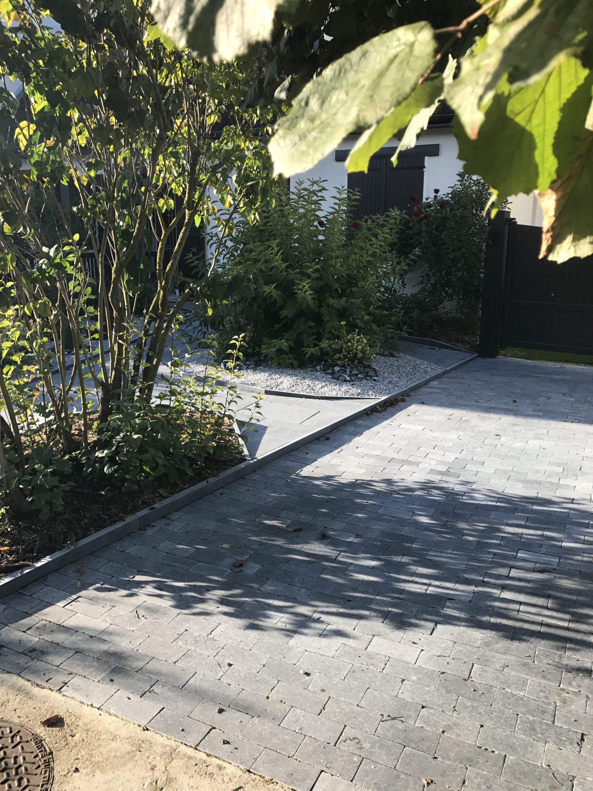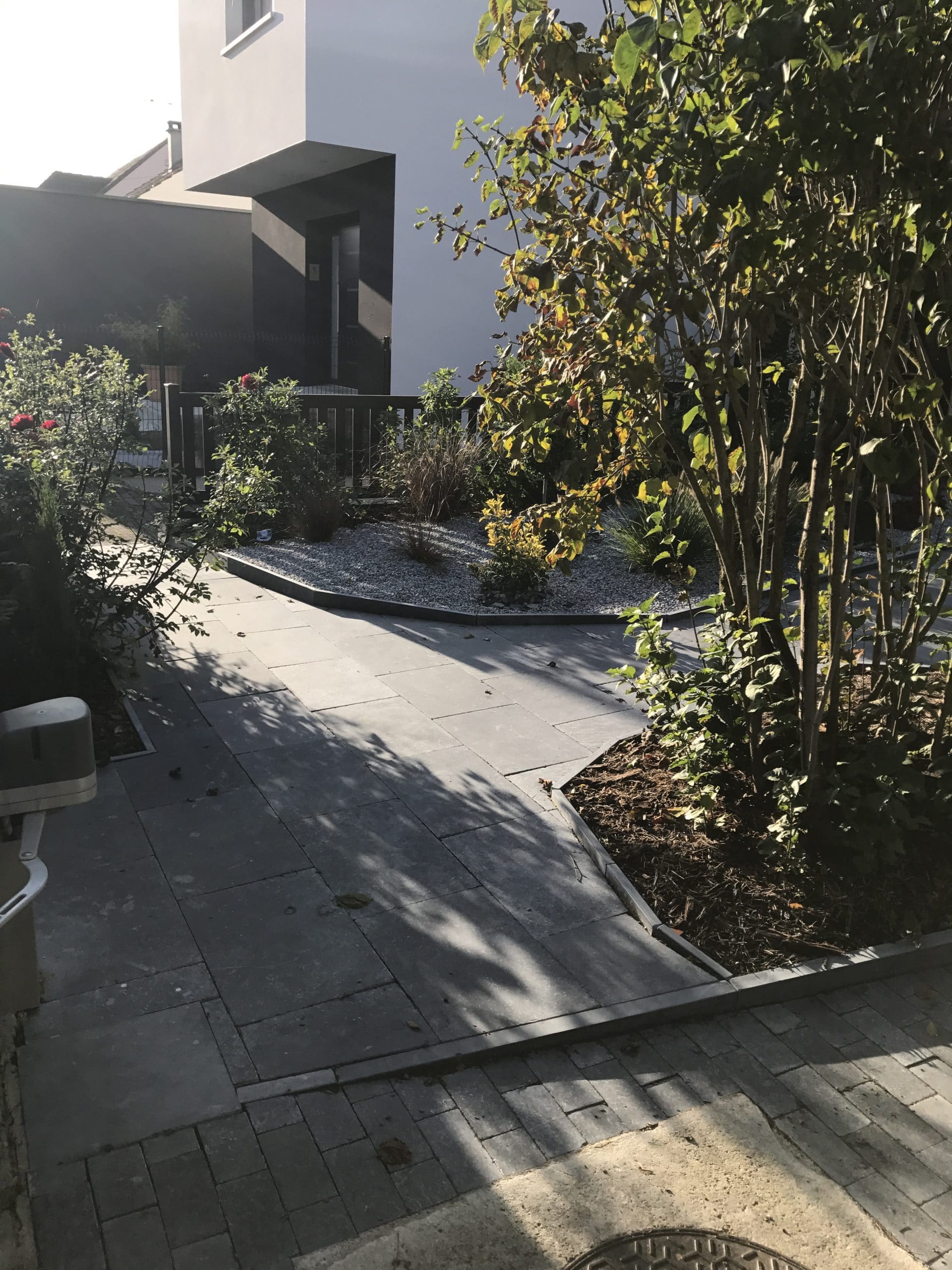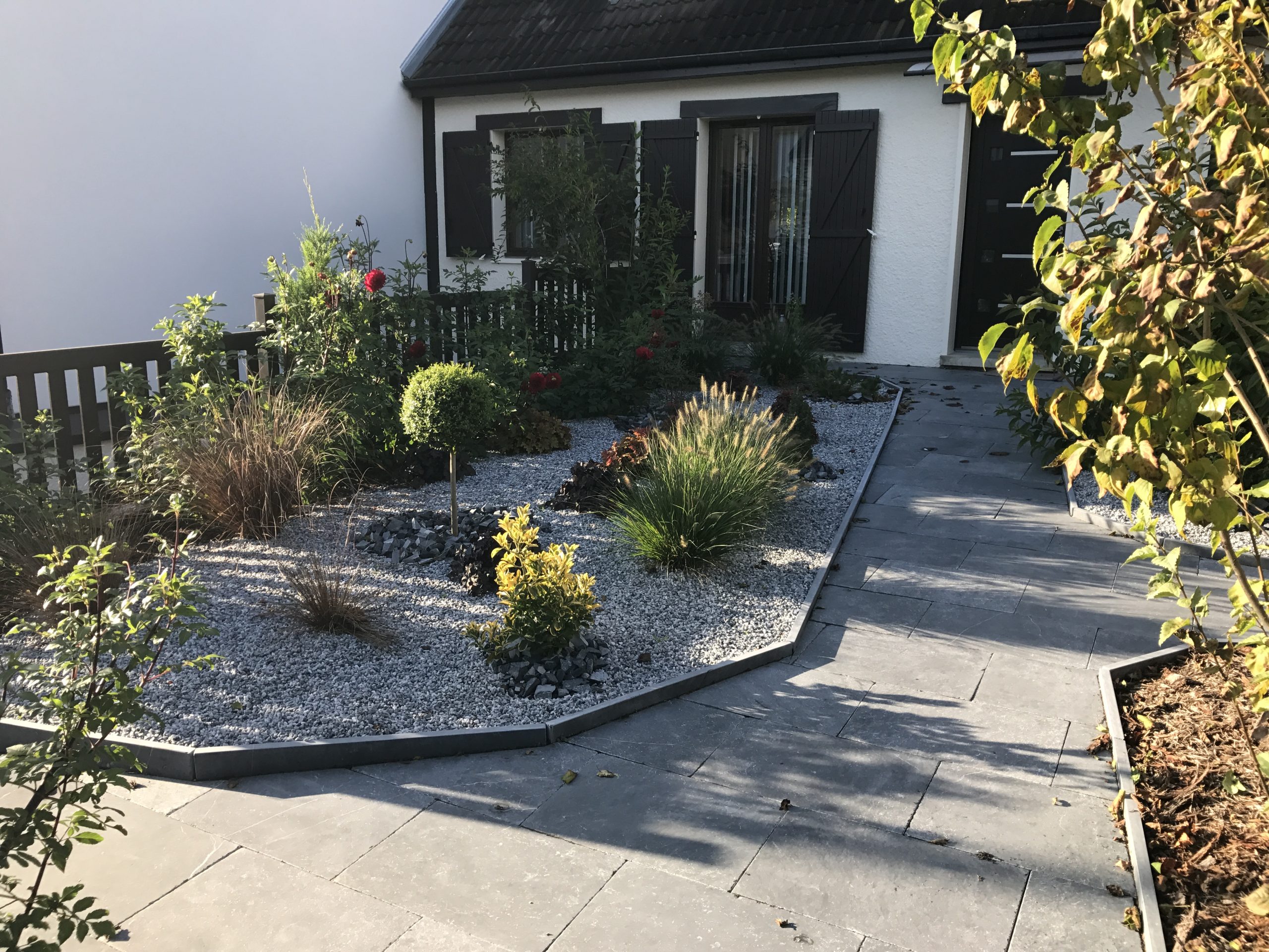 Conception d’un entrée de maison en pierre naturelle. La demande du client était d’avoir le moins d’entretien possible. Nous avons donc crées des massifs avec des petites plantations qui demandent peu d’entretien. Le cheminement et dalle permet une circulation simple d’un espace à un autre. Réalisation sur Tinqueux