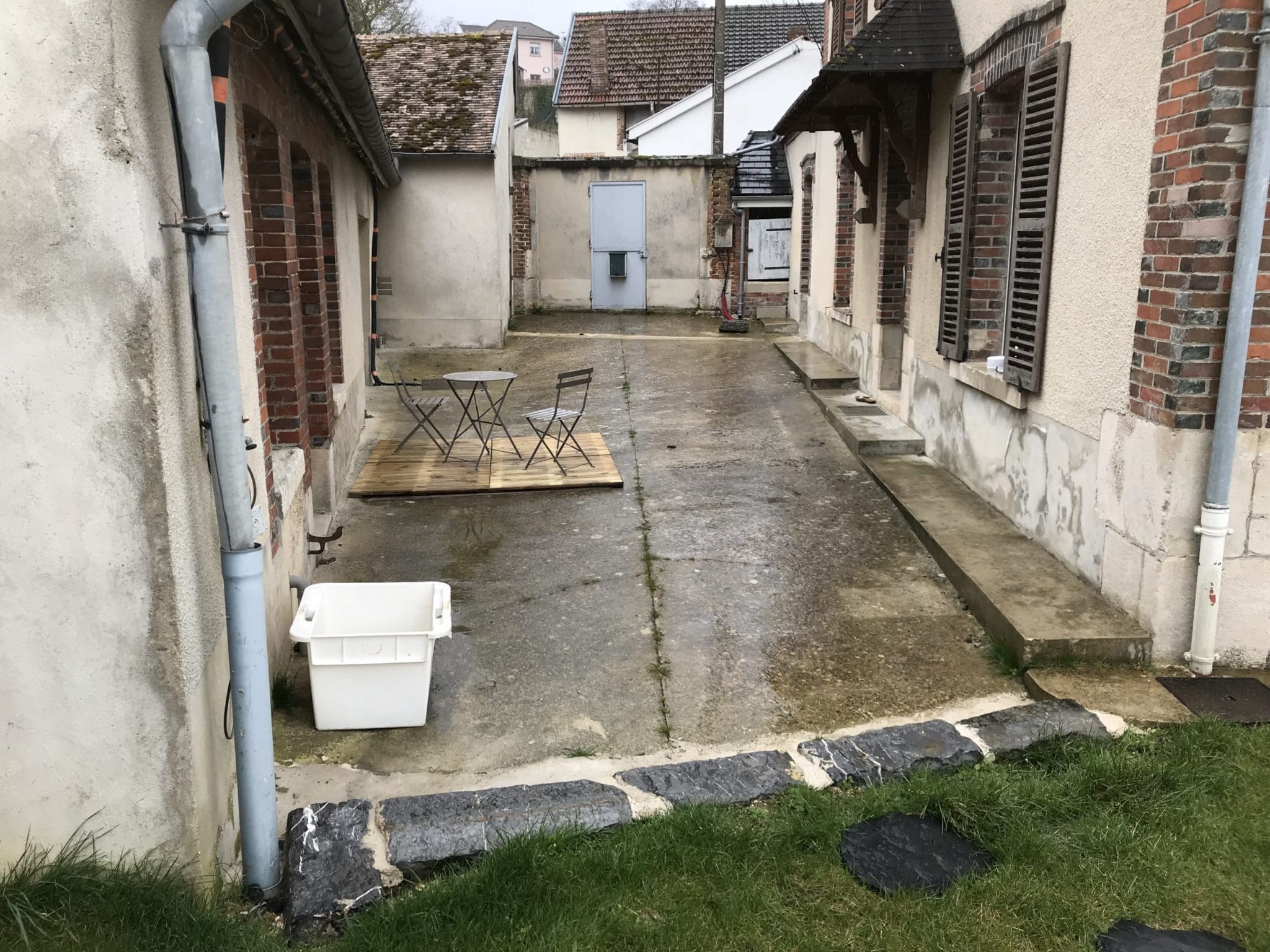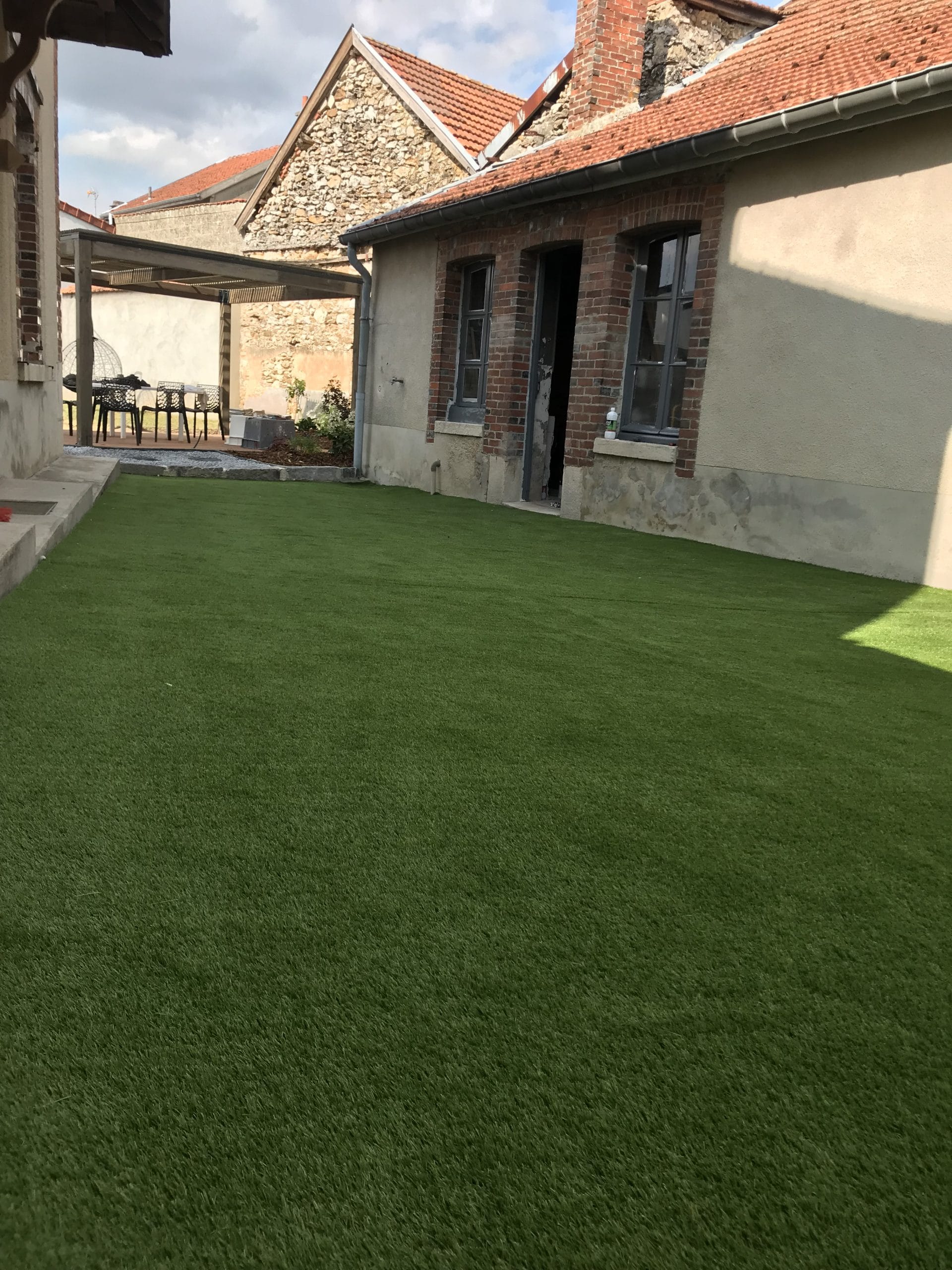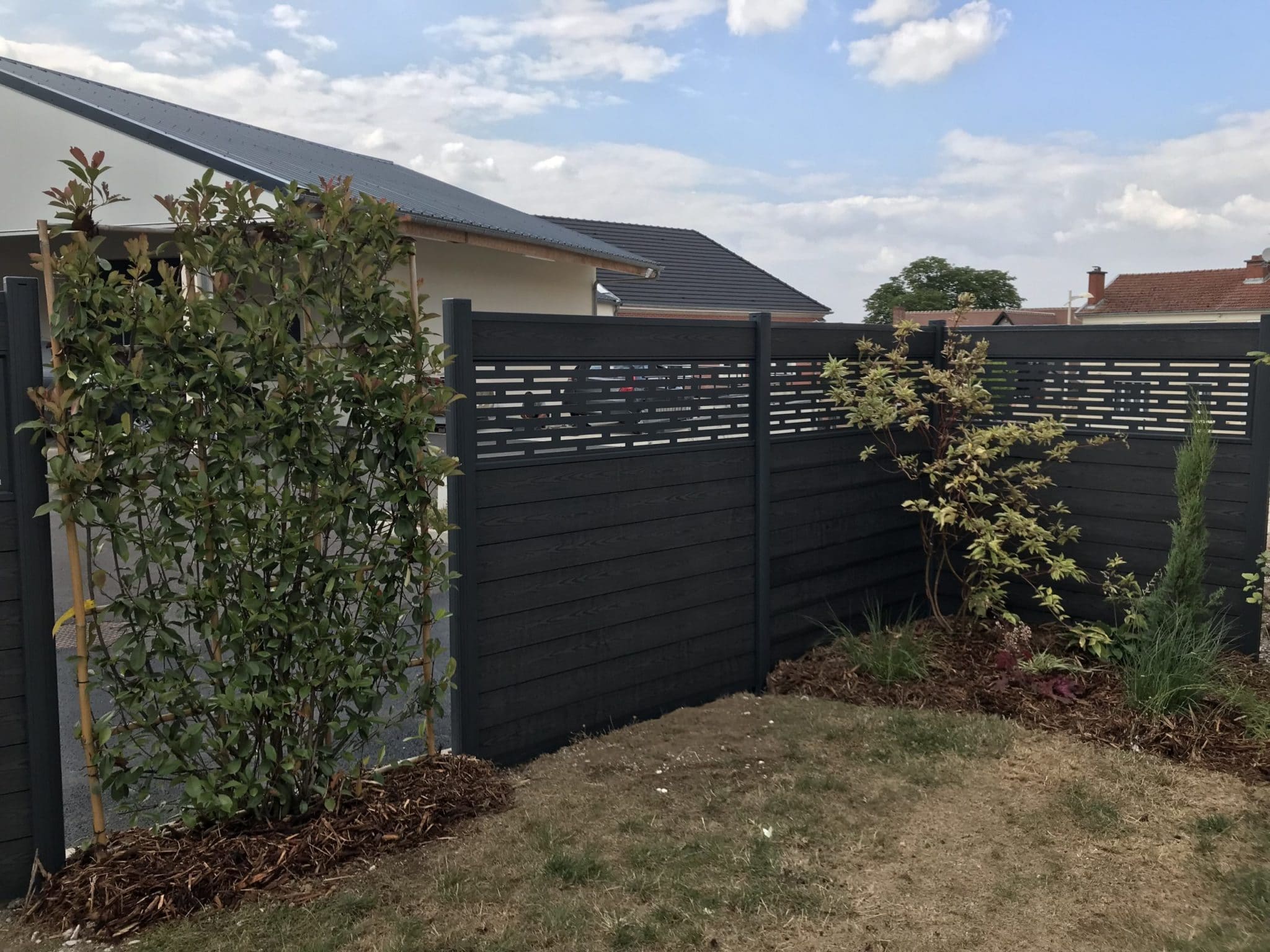Réalisation d’une terrasse en bois composite avec une pergola en bois. Mise en place d’un gazon synthétique pour l’habillage d’une cour en béton. Fermeture du jardin avec un claustra en bois composite et poteau en aluminium, intercalé par la plantation de végétaux tailler sous forme de panneaux. Réalisation sur Cramant.