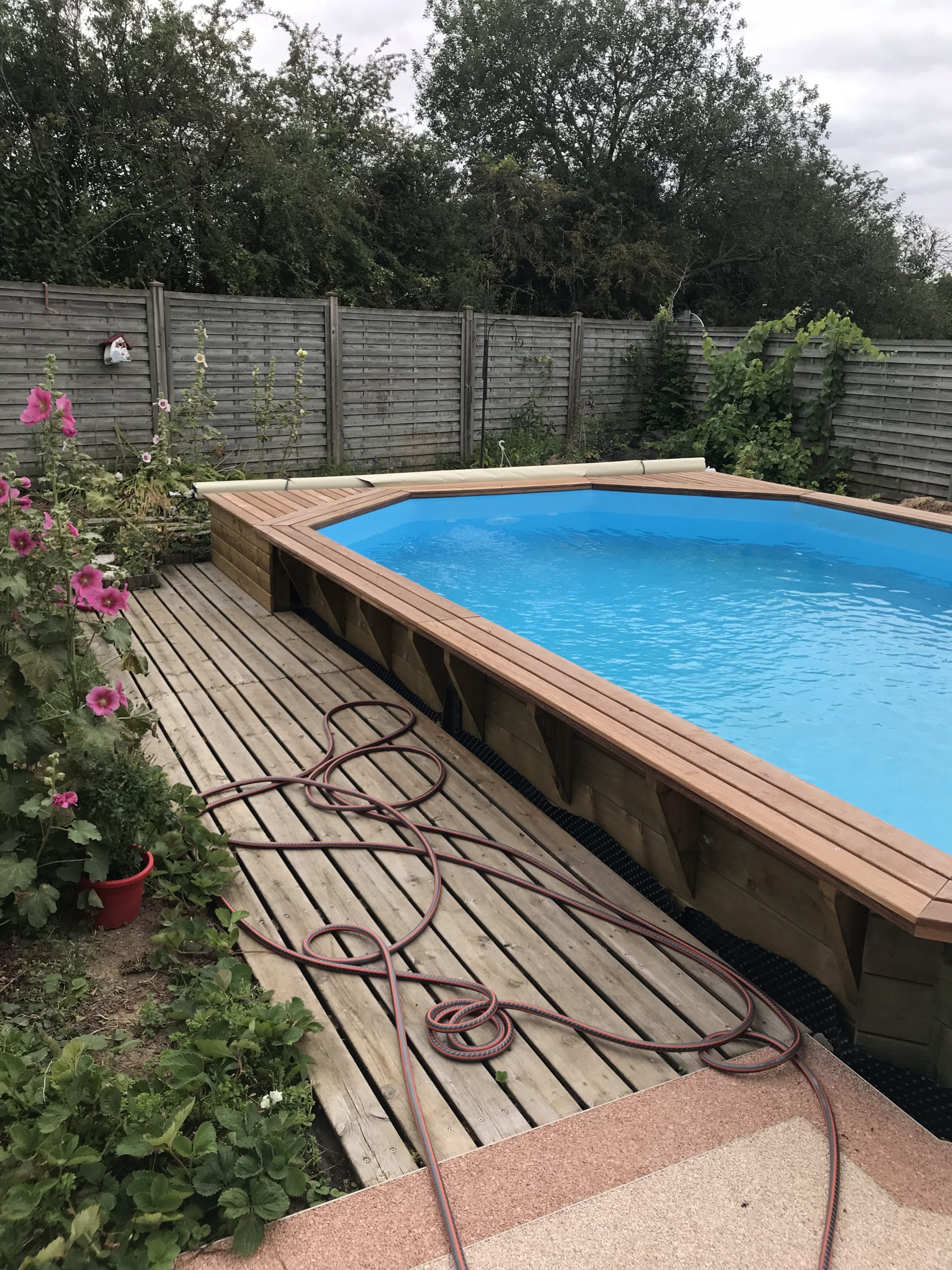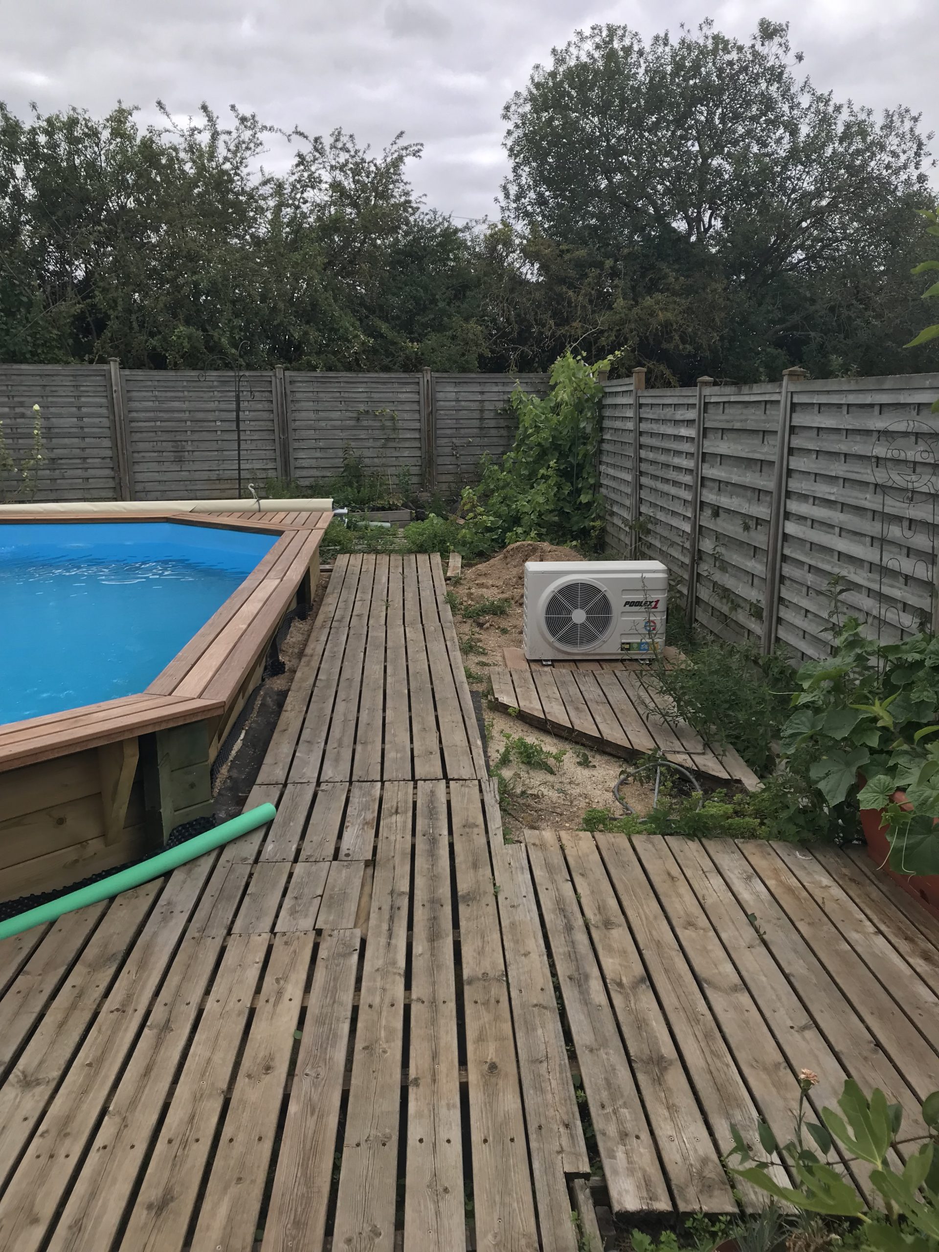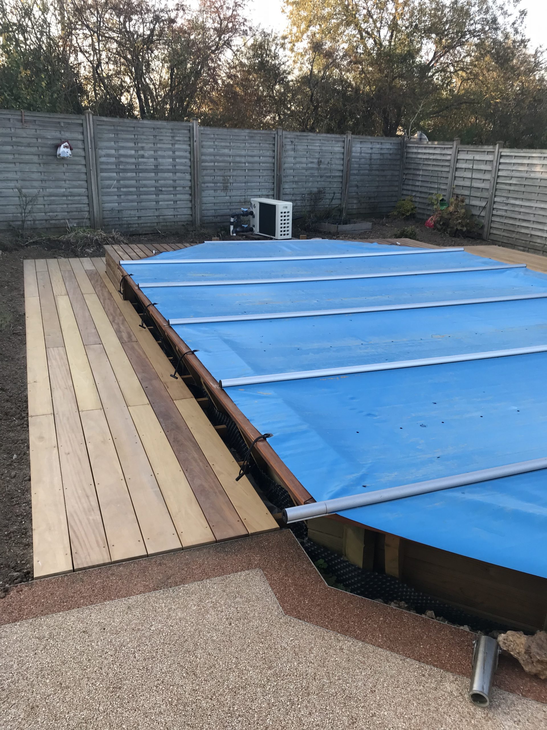 Le souhait de la cliente était l’aménagement du tour de la piscine en bois. Nous lui avons proposé du bois exotique Garapa pour avoir une couleur chaude. Réalisation sur Montbré