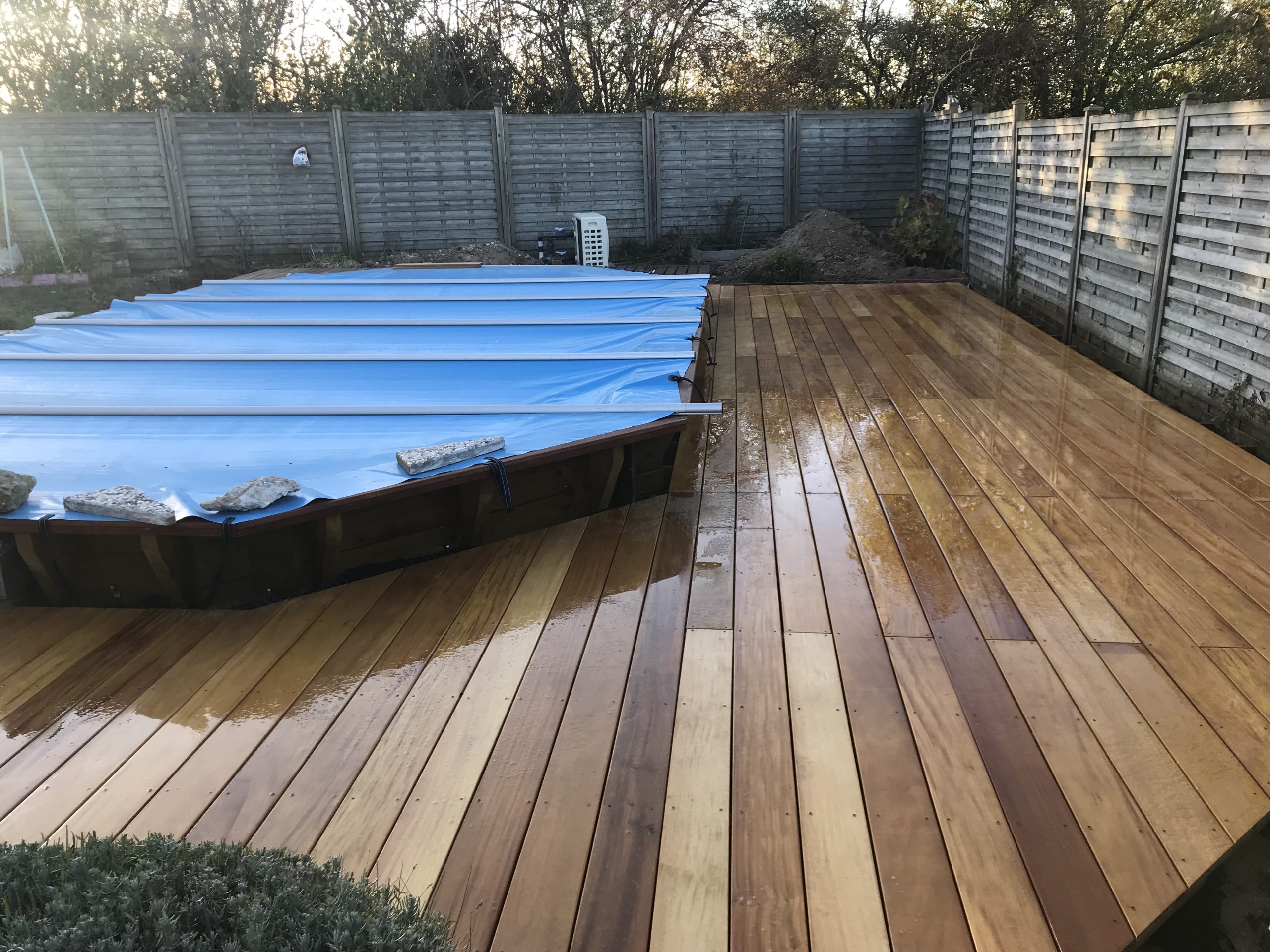 Création d’une terrasse en bois exotique autour d’une piscine.